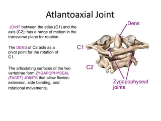 Their unique anatomy allows for 50 ones flexion-extension motion at the occipital C1 joint and 50 of ones rotational motion at the C1-C2 joint. This joint forms a pivot motion. 50 of the rotation of.